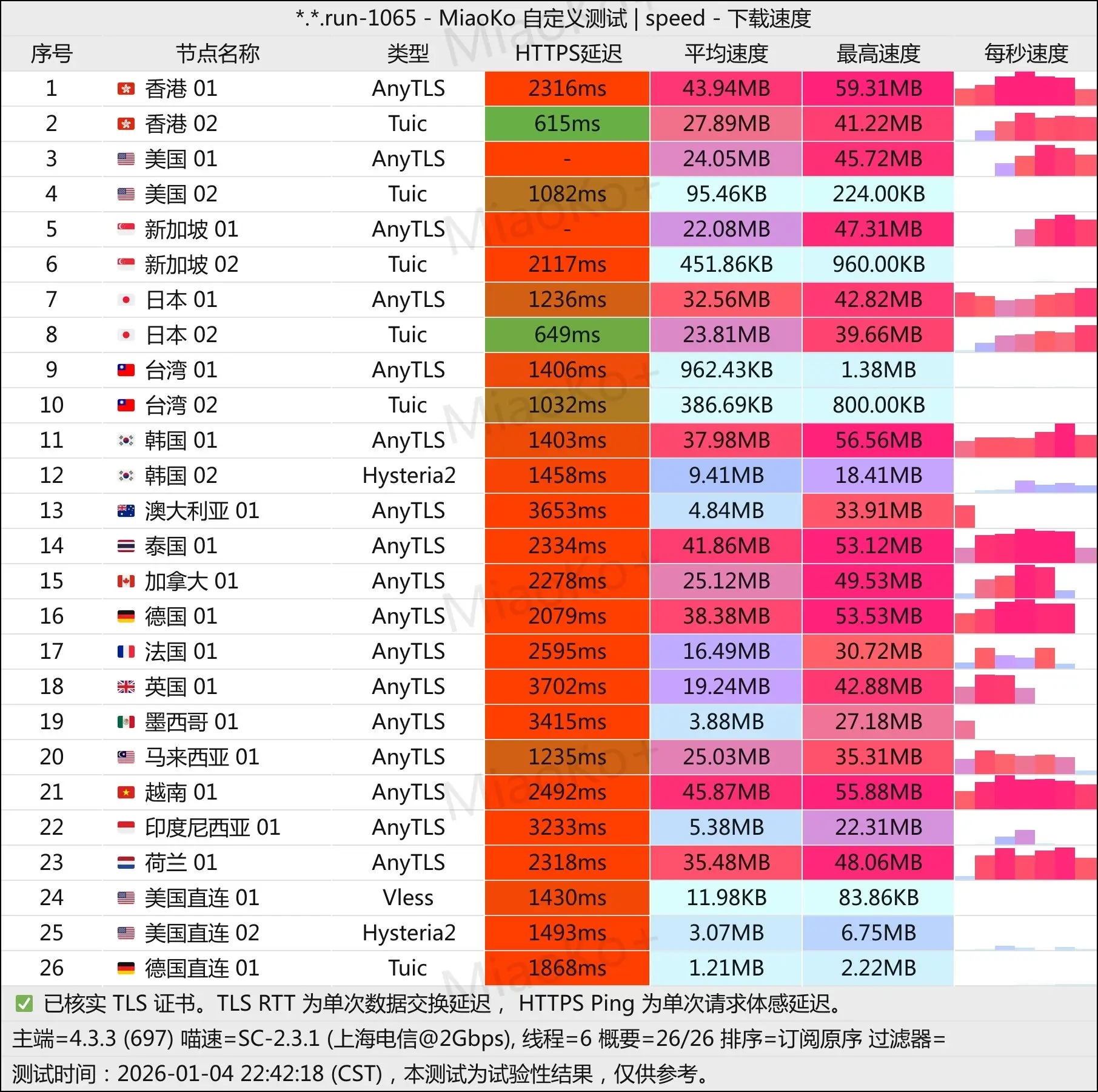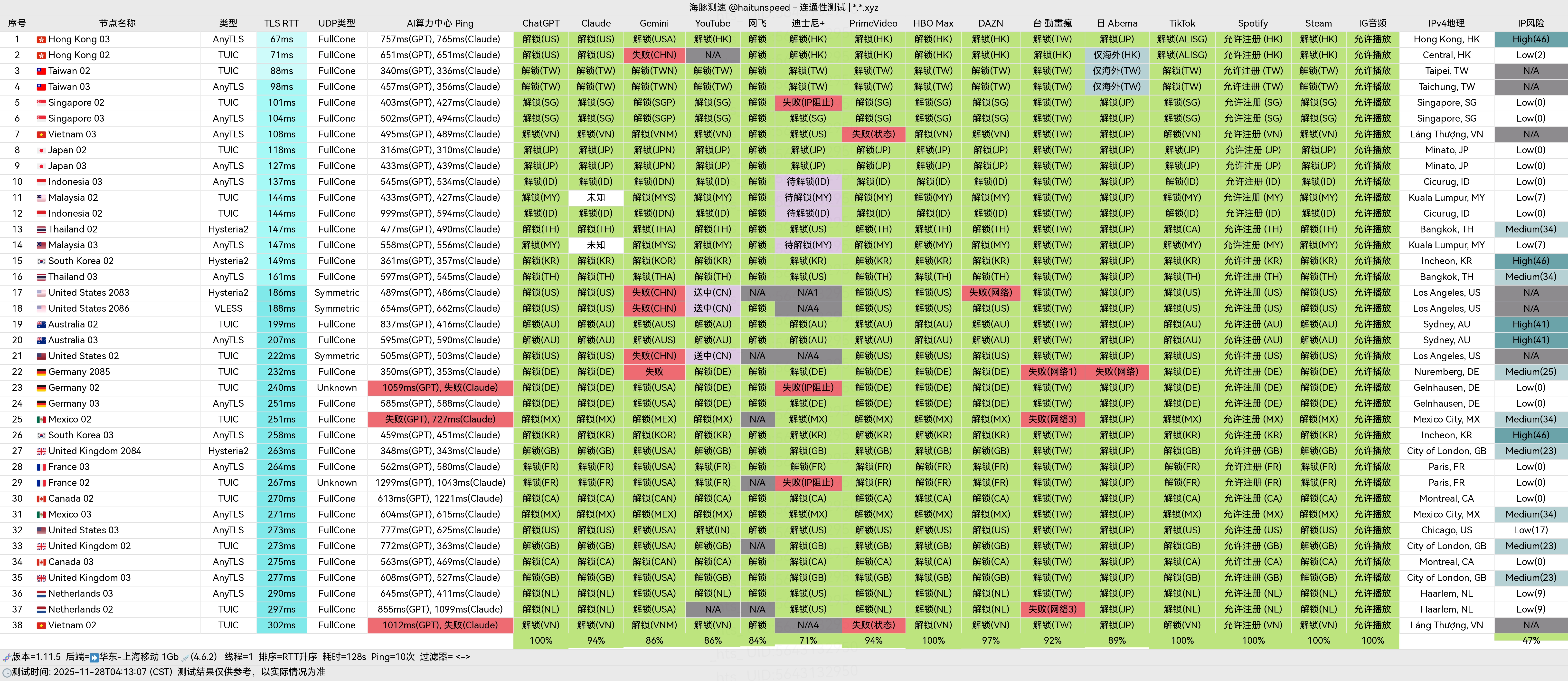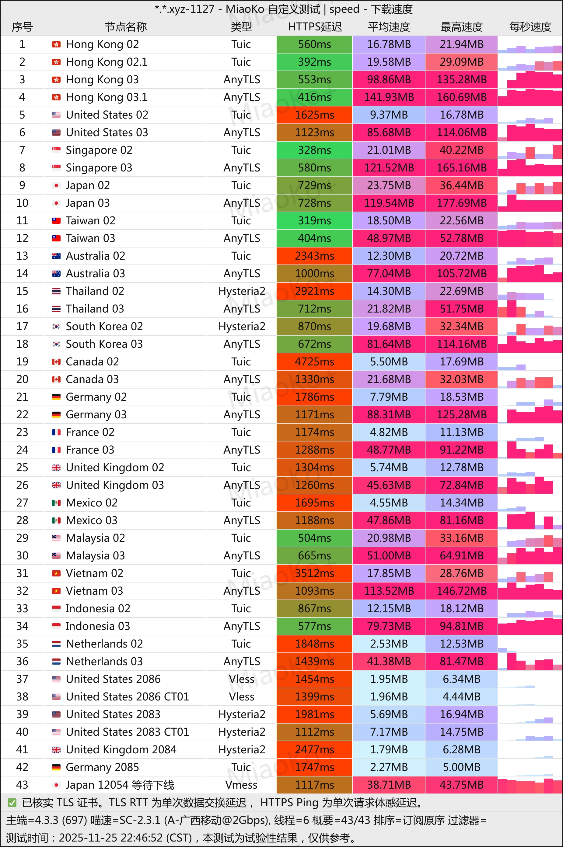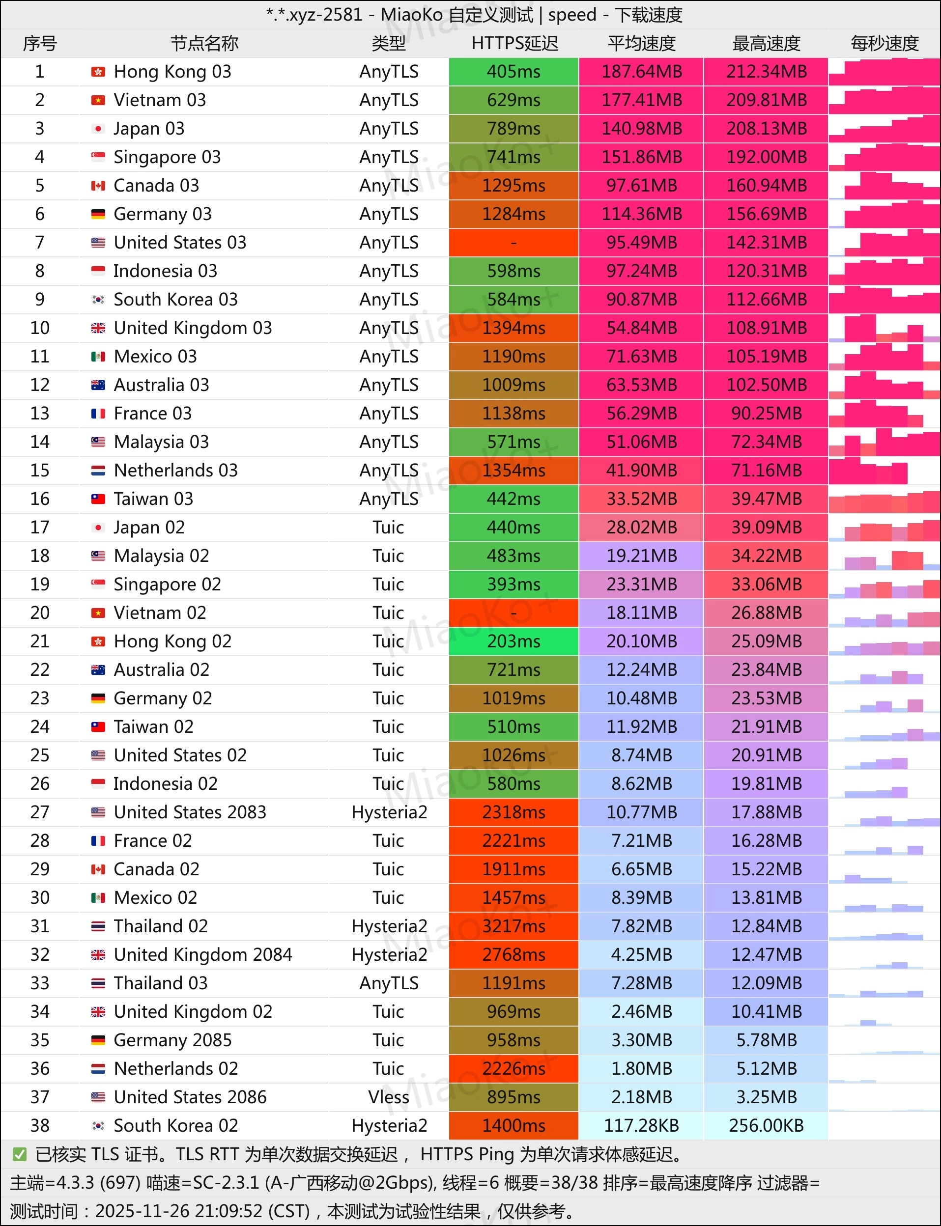 Anytls新协议和tuic协议国内公网中转。2个hy2直连节点。 Anytls新协议跑测速能跑满,tuic因为是基于udp,由于很多地方运营商对udp限速,所以测速跑不满,但是使用足够,老板说是因为有用户说好用所以就留着了,udp主要是更少握手所以延迟会更低且体感会比tcp反应快一点。客户端还有vless协议节点。