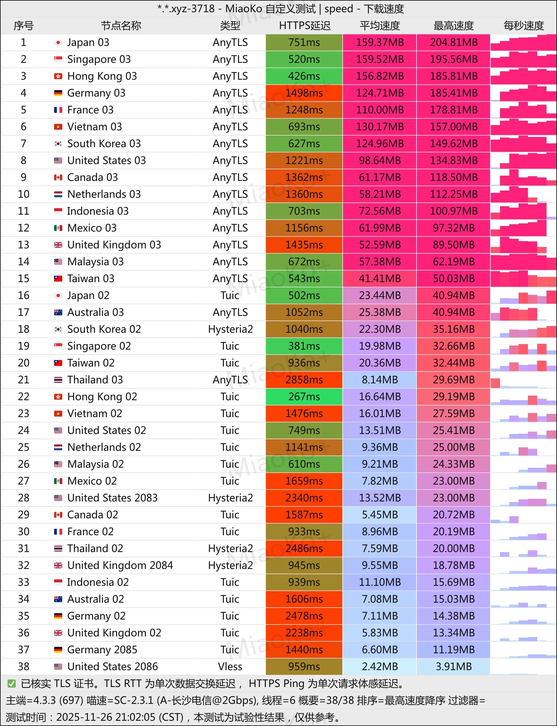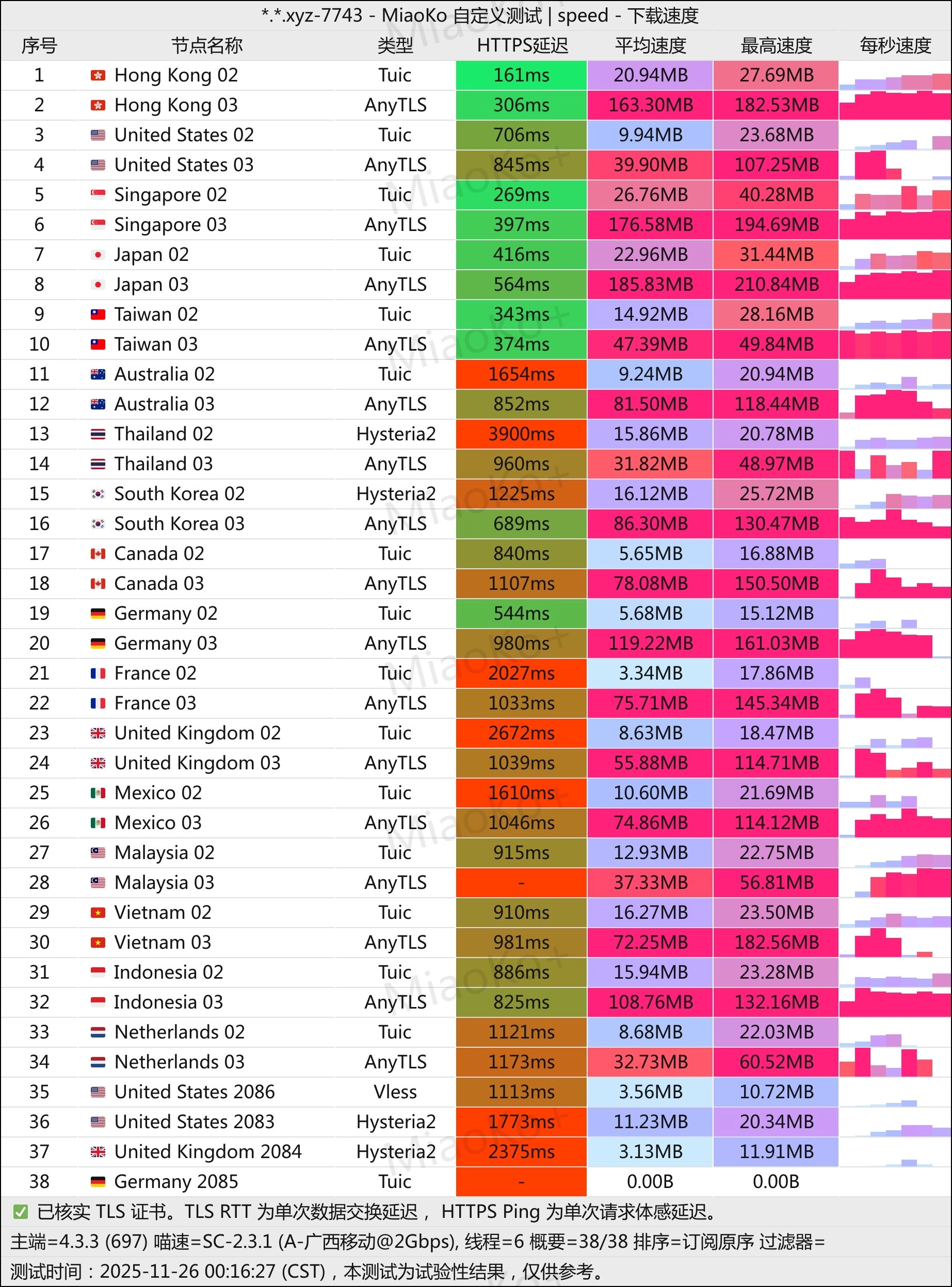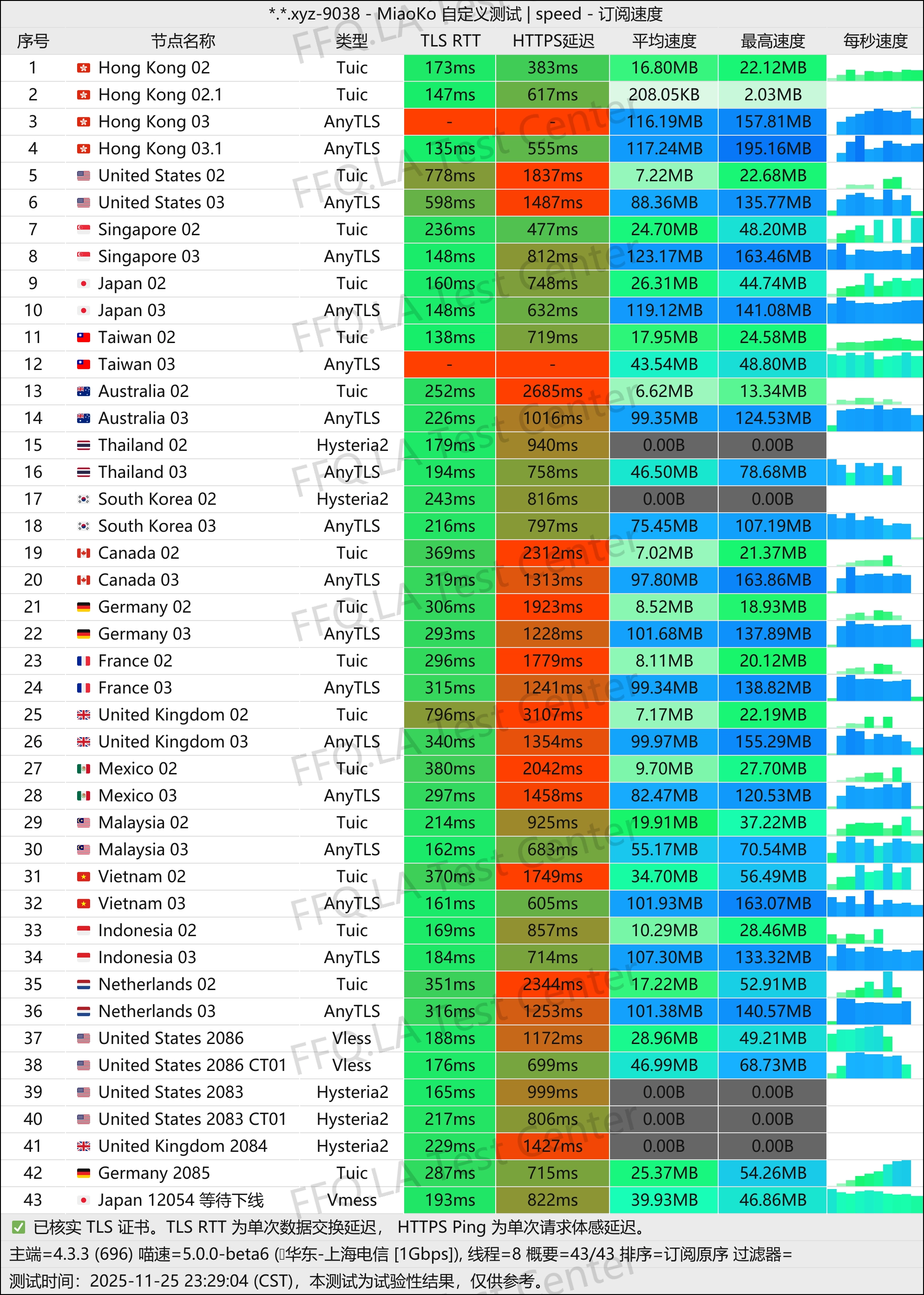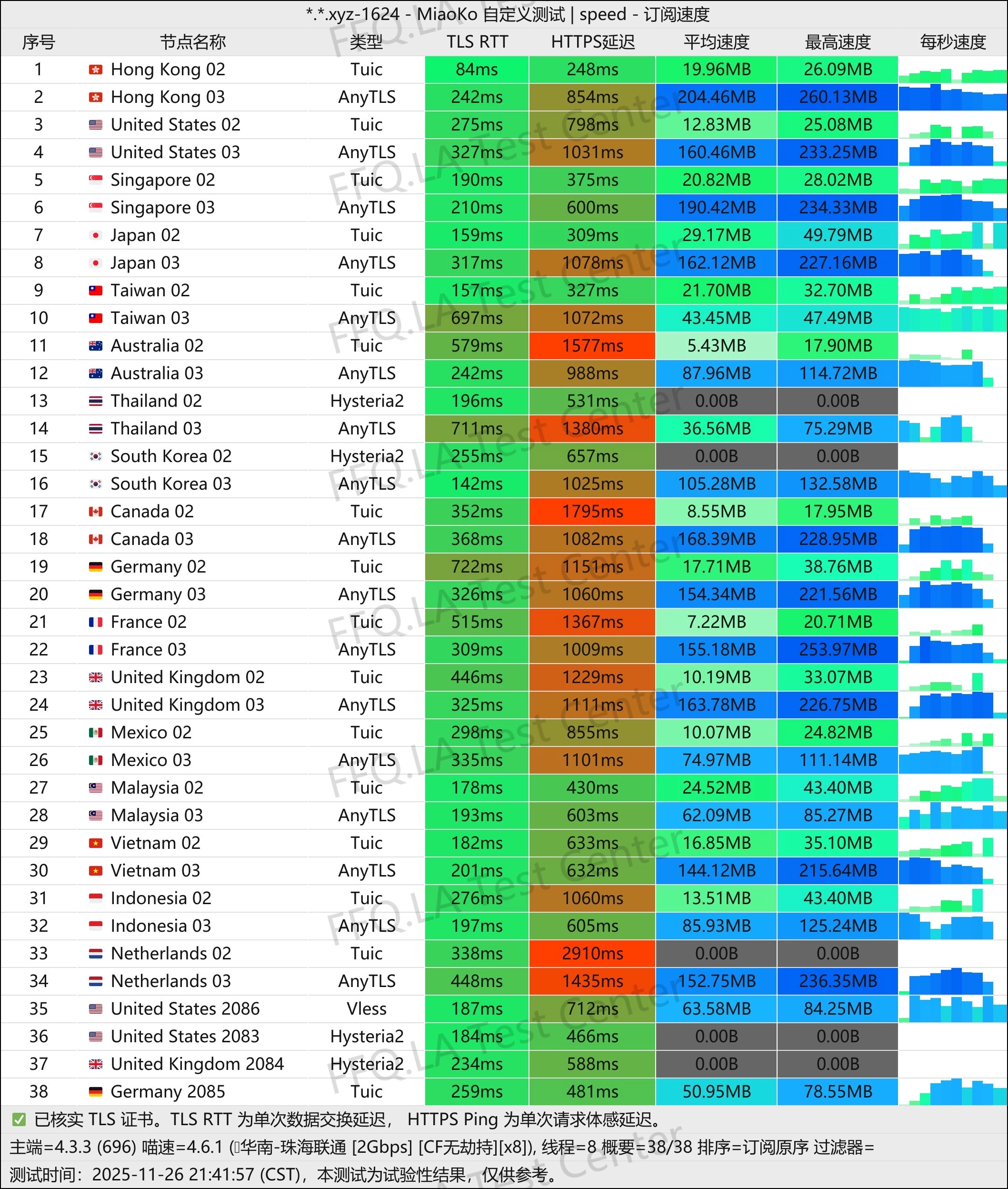 Anytls新协议和tuic协议国内公网中转。2个hy2直连节点。 Anytls新协议跑测速能跑满,tuic因为是基于udp,由于很多地方运营商对udp限速,所以测速跑不满,但是使用足够,老板说是因为有用户说好用所以就留着了,udp主要是更少握手所以延迟会更低且体感会比tcp反应快一点。客户端还有vless协议节点。