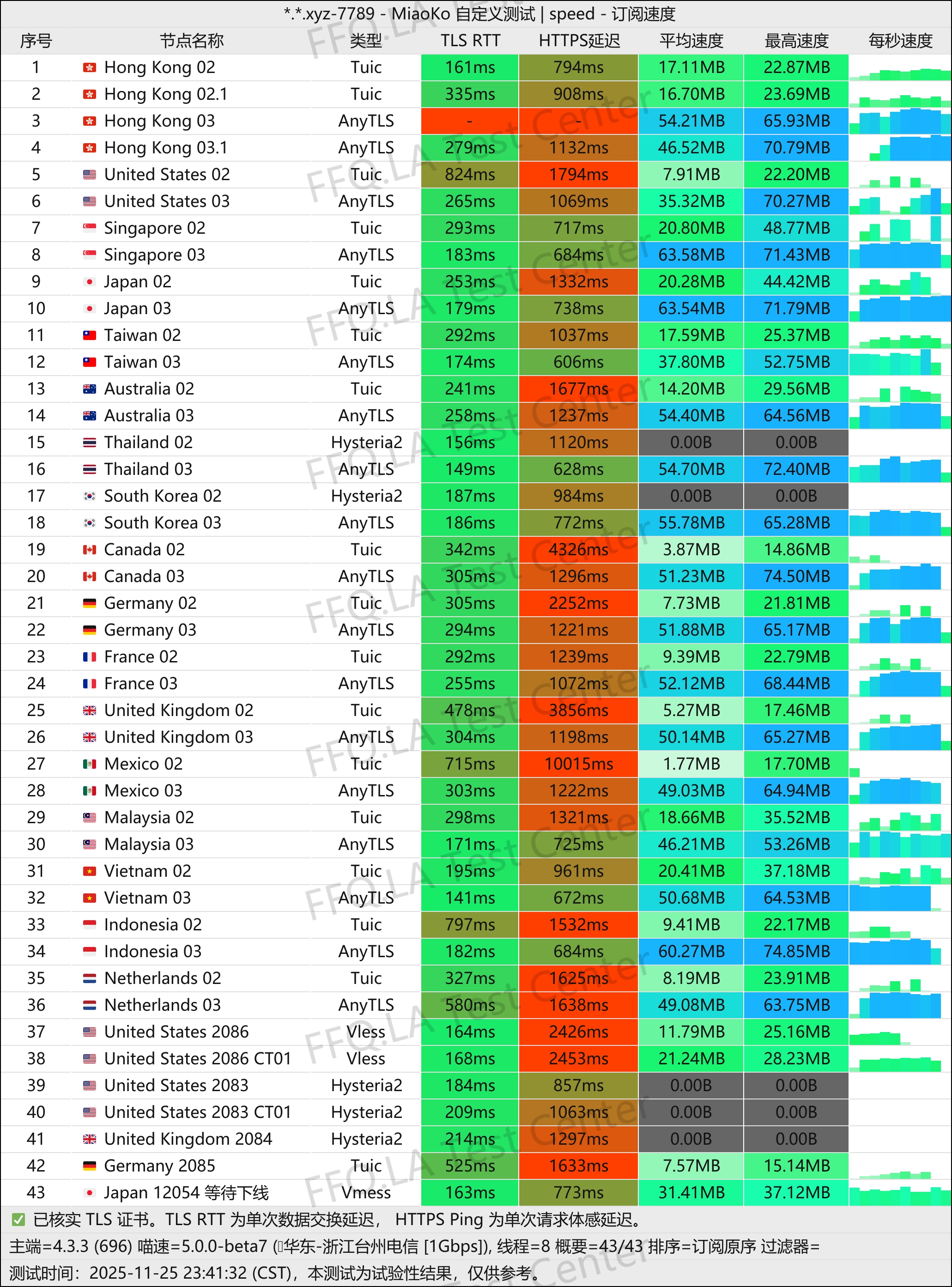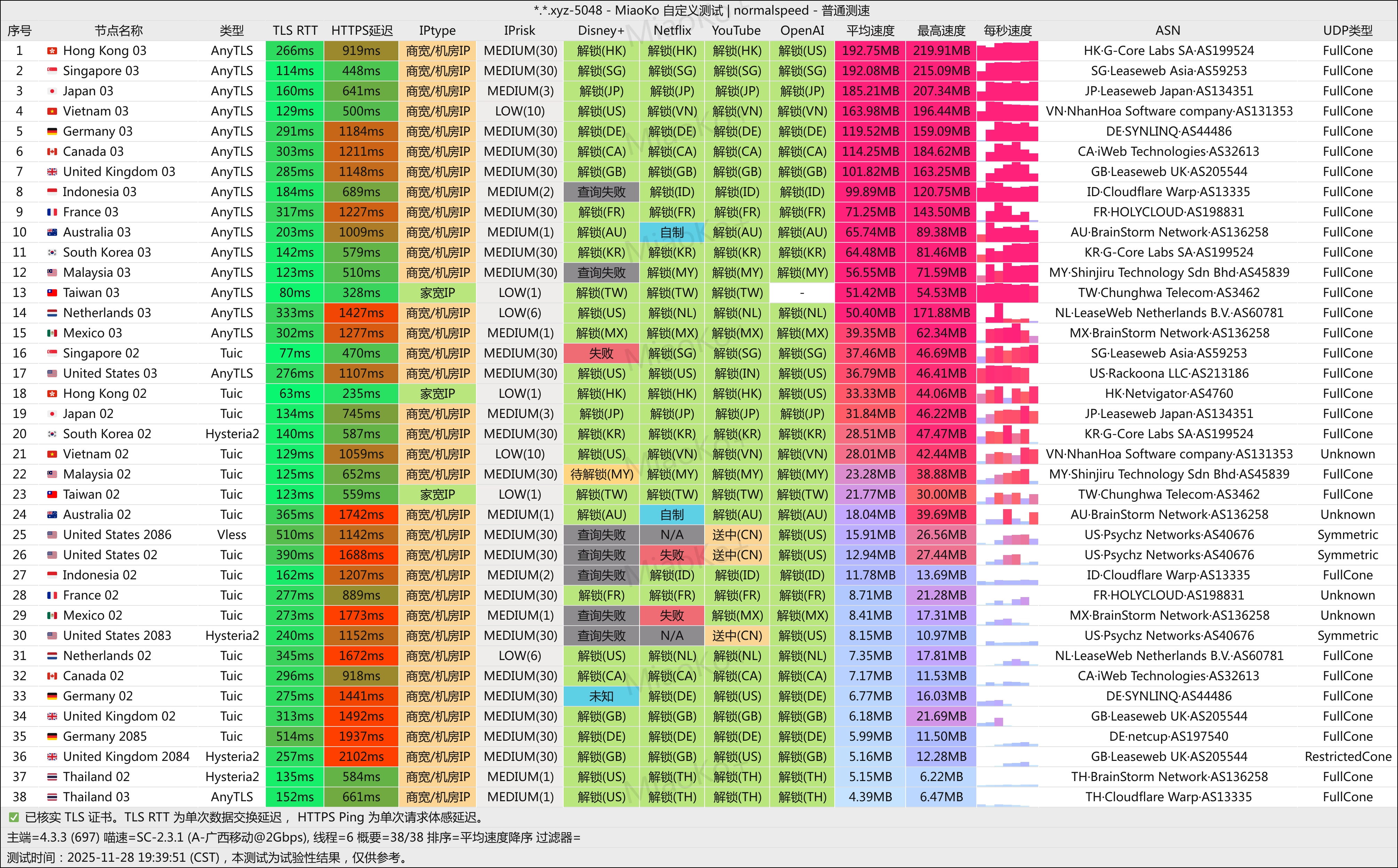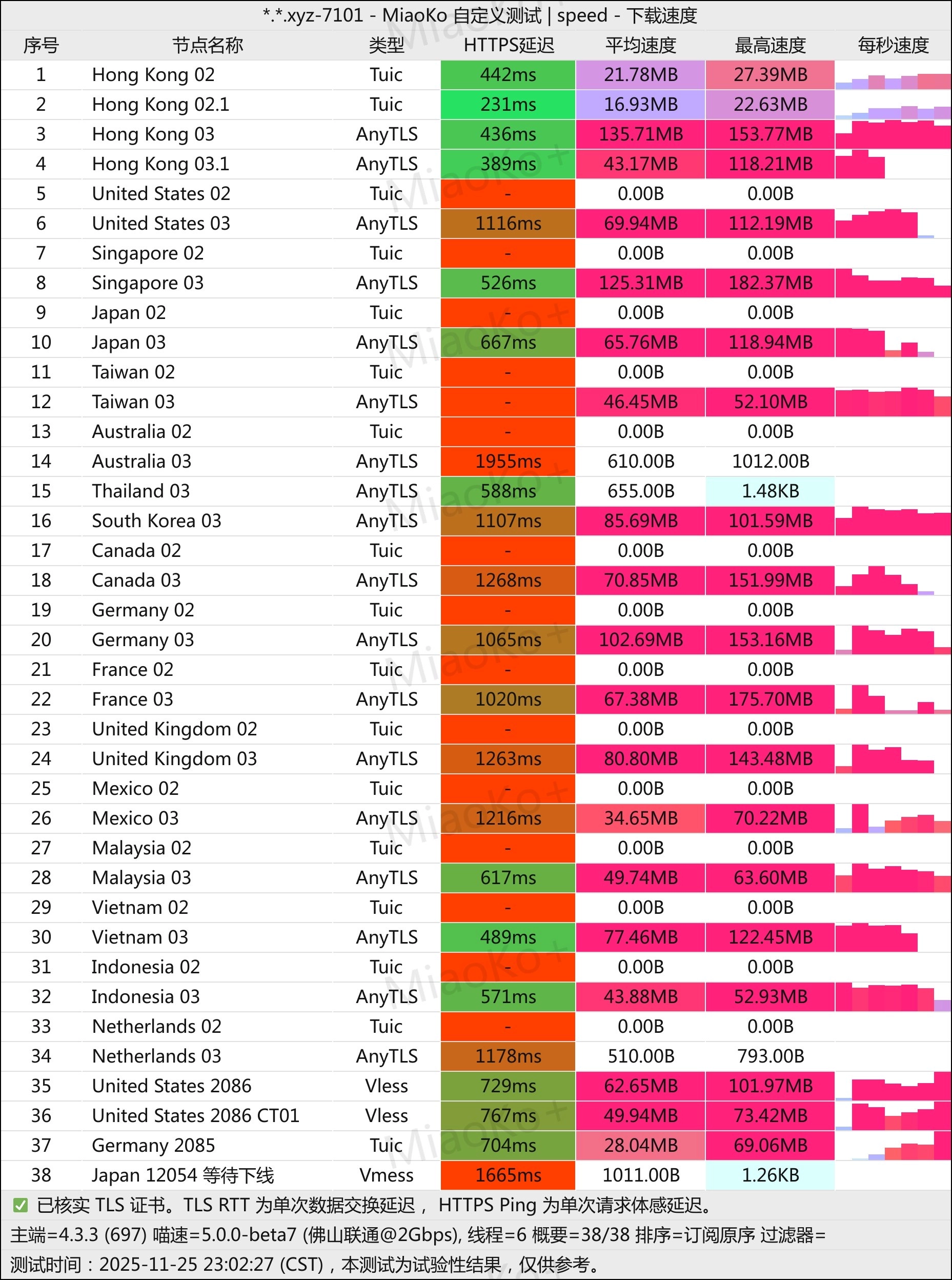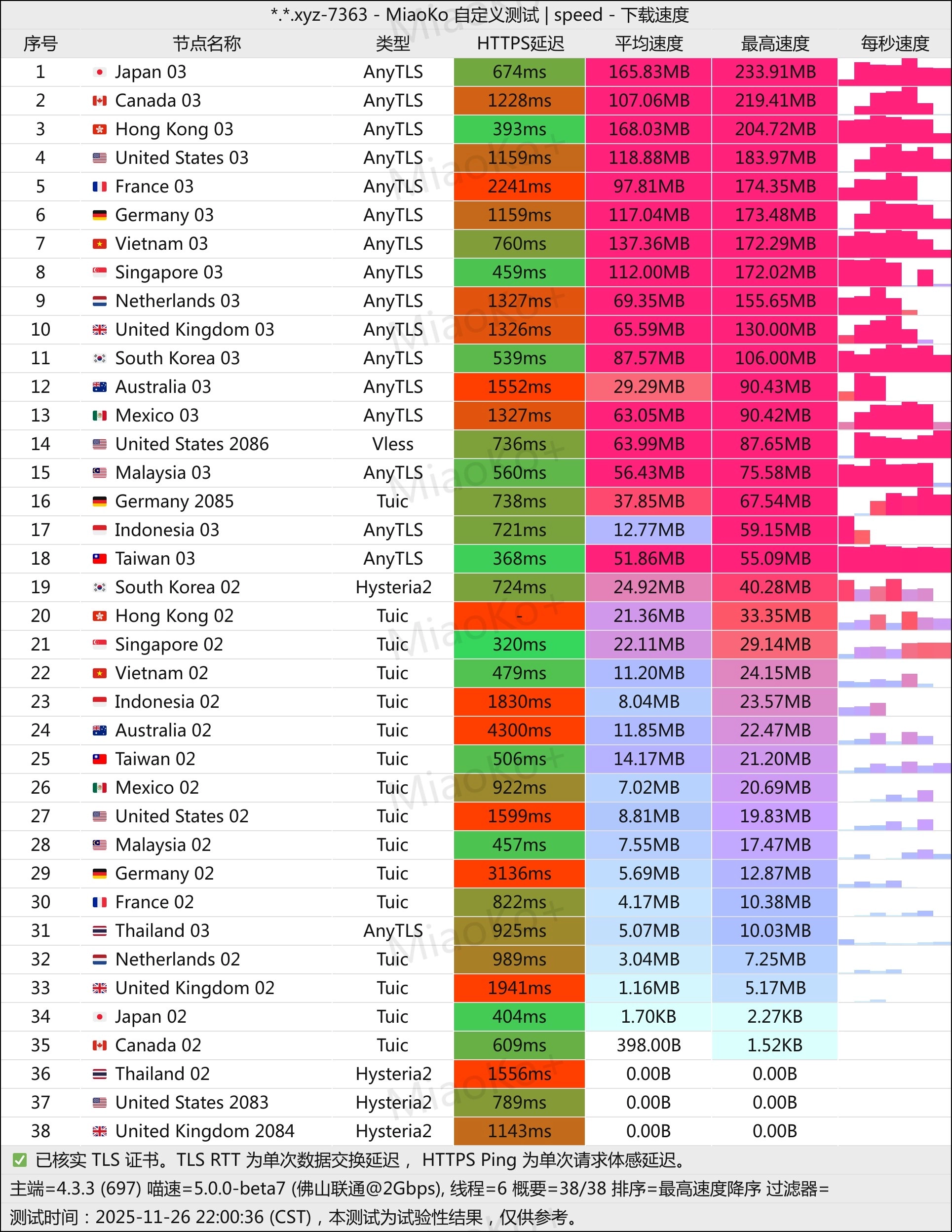 Anytls新协议和tuic协议国内公网中转。2个hy2直连节点。 Anytls新协议跑测速能跑满,tuic因为是基于udp,由于很多地方运营商对udp限速,所以测速跑不满,但是使用足够,老板说是因为有用户说好用所以就留着了,udp主要是更少握手所以延迟会更低且体感会比tcp反应快一点。客户端还有vless协议节点。