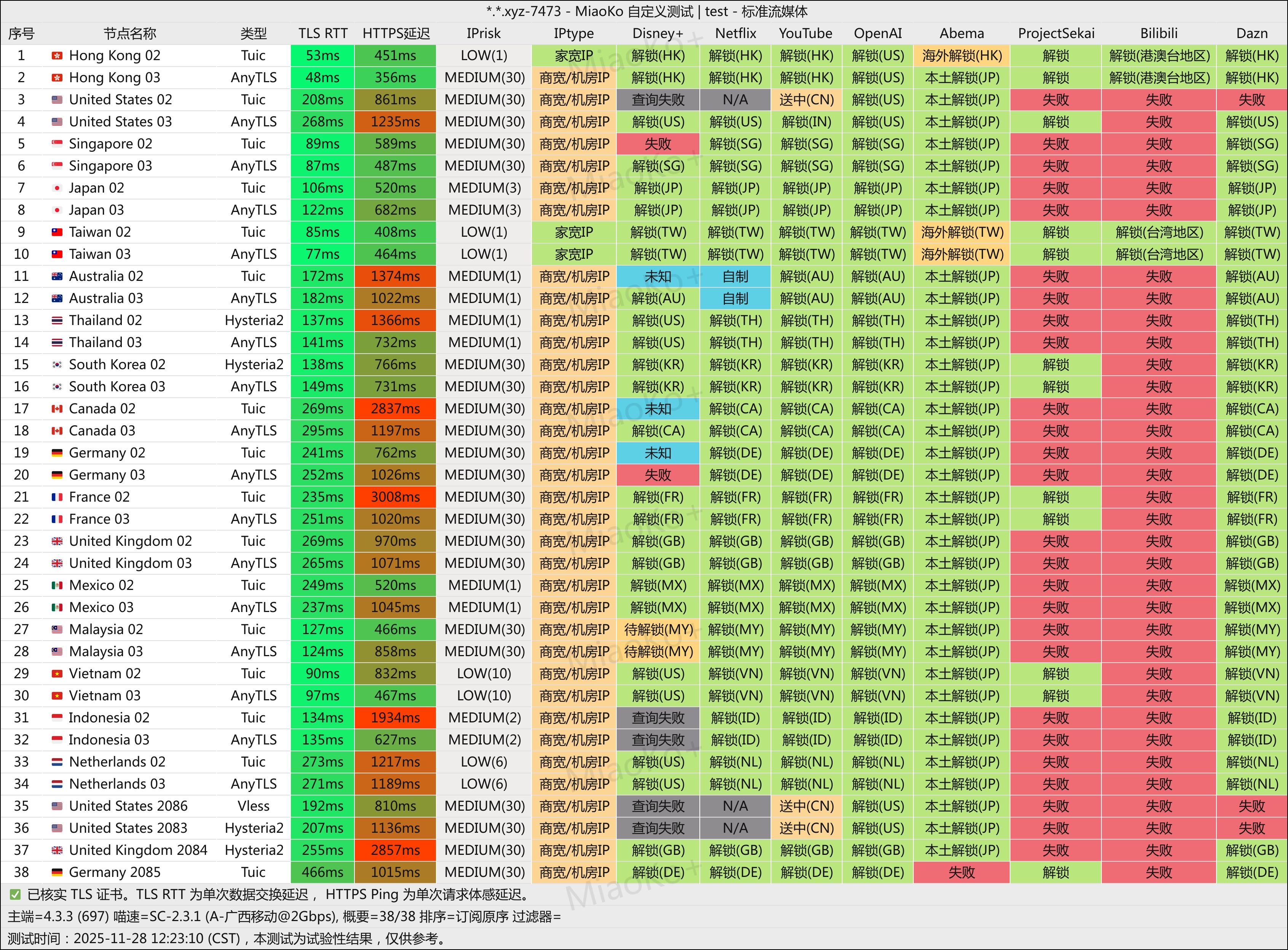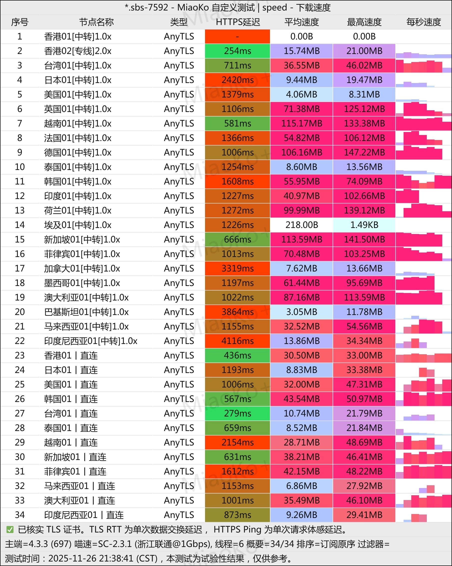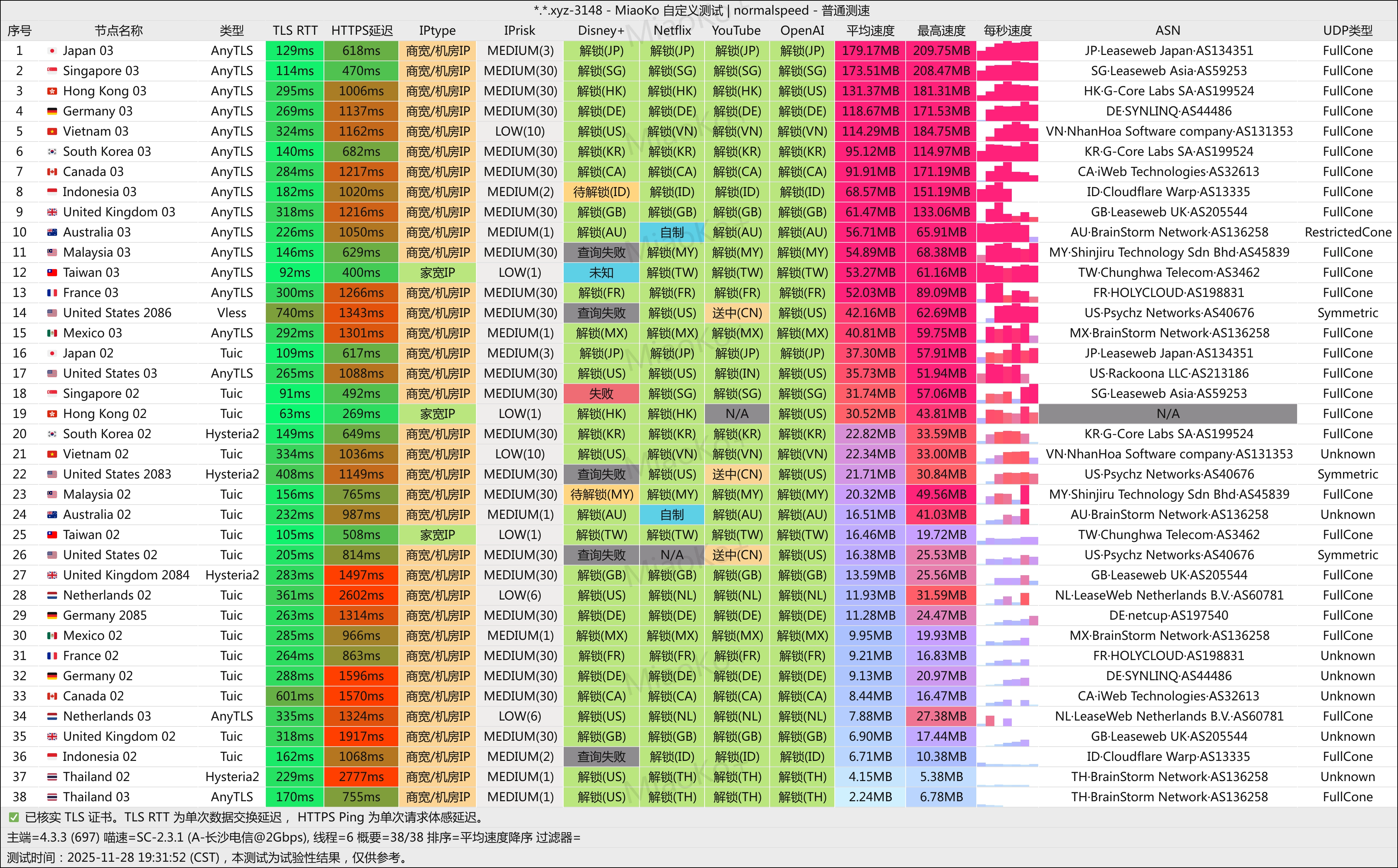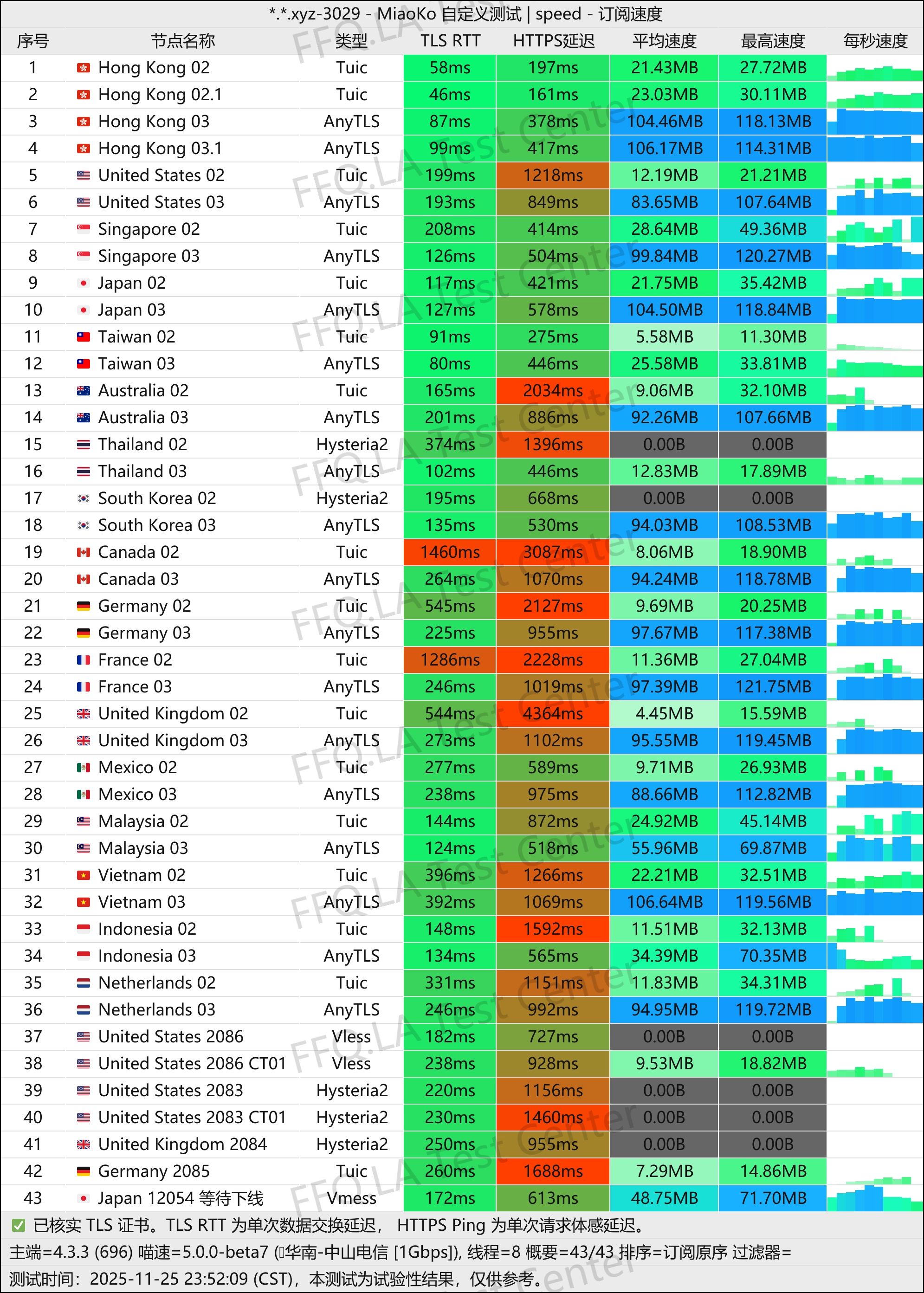 Anytls新协议和tuic协议国内公网中转。2个hy2直连节点。 Anytls新协议跑测速能跑满,tuic因为是基于udp,由于很多地方运营商对udp限速,所以测速跑不满,但是使用足够,老板说是因为有用户说好用所以就留着了,udp主要是更少握手所以延迟会更低且体感会比tcp反应快一点。客户端还有vless协议节点。