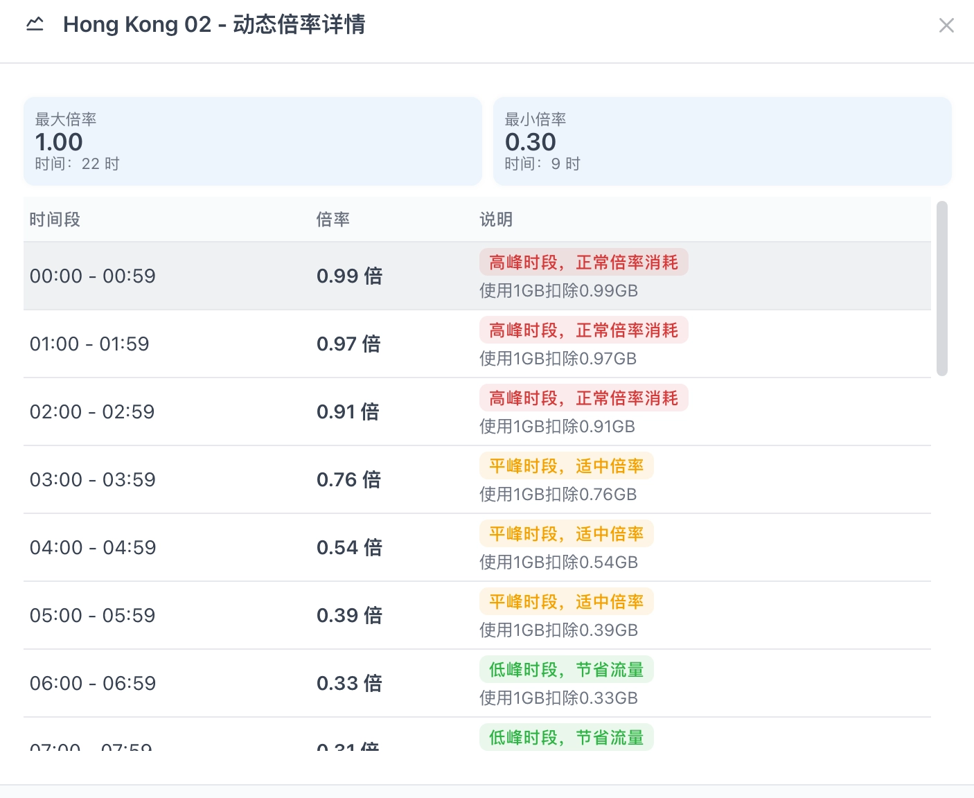 大部分节点开启动态倍率,0.1~1倍率,按时间段计算倍率。usa有两个节点0.1倍率.